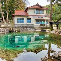 赤い石とエメラルドの水の対照が美しい「百名水」のパワースポット池。