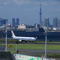 昼過ぎの羽田空港第1ターミナルの展望デッキから、飛行機と東京の景色を望む。