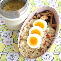 辛いものが無性に食べたくなり、この日はカレーのお弁当にしました。スープジャーさえあれば簡単に作れるので、定期的に作っています。 グリーンカレー、ゆで卵、キノコのソテー、ジェノベーゼ炊き込みご飯 グリーンカレー弁当の作り方