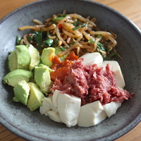 余ったもやしのナムルを豆腐サラダにアレンジ。アボカドも一緒に加えて、糖質控えめのサラダができあがりました。ボリュームたっぷりでランチにも!