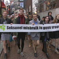 Op het Spui in Amsterdam wordt geprotesteerd tegen seksueel geweld. Om een punt te maken, deden mannen een minirok aan.