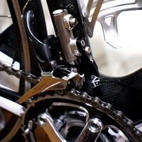 メインバイクのコンポーネントにシマノUltegra6800を使用しています。フロントディレーラー(以下、FD)はFD6800です。アウターチェーンリングにはスギノの小さなギアを使っているので、FD位置はチェーンステーに干渉するギリギリまで下げています。このフレームは直付けFD台座なので普通に取り付けては下げきれません。そ…