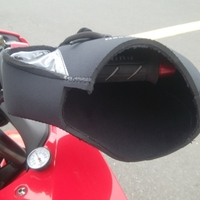 前回のあらすじ ハンカバをつけたら危険が危なかった 改造 はい!というわけで~() 早速ハンドルカバーを改造しました 前面の見た目は変わらず 幽霊が映ってますね 右側は袖口を大きく裁断バサミでチョッキン スイッチ方面も少し開放 こっちのボタン部分はあまりいじらないのでそのままに 左側は忙しい左手(意味深)を邪魔…