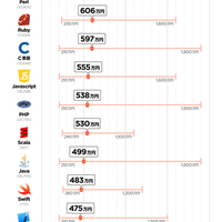 求人情報を基にしたプログラミング言語別の平均年収ランキングをビズリーチが発表した。