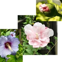 ムクゲが咲き始めました. ピンクの八重花とムラサキの二株.ほぼ同時の開花. ムクゲとは - 育て方図鑑 | みんなの趣味の園芸 NHK出版 にあるように, 「暑さで人や植物が元気のなくなる季節に、次々と大きな花を咲かせるムクゲは、盛夏を彩る代表的な花木」. (ただし,俳句では秋の季語だとか.実感とはかなり違います…