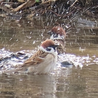 2月28日。(↑)有馬富士公園の帰り。 JR新三田駅横の武庫川で、スズメが集団で水浴びをしていた。 岸辺にある樹木に数十羽のスズメが居て、交代で浅い水辺に降りては、派手にバシャバシャと水浴びしていた。なんか楽しそう。