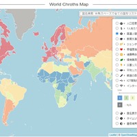 以前に、「Leafletを使った凄い地図たち」という記事を書いた。 Leafletを使った地図で「世界の国別統計色別マップ」というのを見つけた。 実際の地図は以下。 人口密度、1人あたり国民所得、国連人間開発指数、教育水準指数、ジェンダー平等指数、幸福度指数、健康寿命年齢、環境負荷指数、災害リスク指数、平和リスク指…