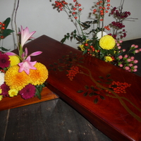 *花あしらい展初日多くのお客様にお出かけ頂きました。 南天の絵柄の漆の小物入れを花器に見立てて、 小菊数種とカマツカという実物、 ヒペリカム、リコリス、そして南天を入れてみました。 植田早苗 作 「かそけき花」 鈴木れい子 作 「宵の香り」 飯嶋 泉 作 「花と野菜のサラダは如何 ? ! ♪ ♪ 成田怜子 作 「さわや…