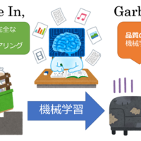 用語「Garbage In, Garbage Out」について説明。ゴミ(Garbage)のような不良データを入力すると、出来上がる機械学習モデルもゴミのように不良なものになる、という戒め/金言のこと。ゴミを入れないのは簡単なように見えて難しい。