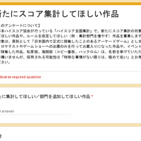 【このアンケートについて】 ・日本ハイスコア協会が行っている「ハイスコア全国集計」で、新たにスコア集計の対象としてほしい作品や、ルールを改定してほしい(例:集計部門を増やす)作品を募集します。 ・対象は、原則として「日本国内で正式に稼働したことのあるアーケードゲーム」とします。ロケテストやゲームショ…