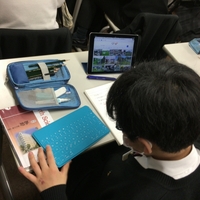 広尾学園の生徒たちのiPadの使い方は非常にユニークです。机の上の様子を見てみるとiPadとキーボードをワイヤレスで使っている生徒がいました。ノートと映像(iPad本体)とキーボードの配置によって、学び方が変わるので、この生徒にはこの配置がベストだということなのでしょう。 (為田)