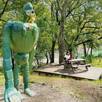 ダムサイトにジブリアニメのキャラが 所在地は宮崎県なのにダム管理者は大分県という、ちょっと変わった発電用ダム。 ダムサイトに資材置き場を兼ねた未舗装の駐車スペースがあるが、ここになぜか宮崎アニメのキャラクターが! ラピュタのロボット兵が迎えるように立ち、ベンチにはカオナシ、テーブルには王蟲の子ども・・…