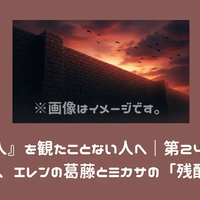 『進撃の巨人』第24話「慈悲」を観たことがない方向けに解説。正体を現したアニを前に、仲間を信じたいがゆえに戦えないエレン。絶望的な状況下で突きつけられるミカサの冷徹な言葉と、アルミンの「非情な決意」が、エレンの心を激しく揺さぶります。一人の少年が「慈悲」を捨て、人類の希望である「怪物」へと覚醒する運…