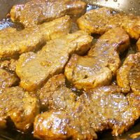 「メバチまぐろステーキ♪」の作り方。見た目お肉、食べてやっぱりマグロかな? 材料: メバチまぐろ、オリーブ油、にんにく
