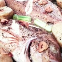 「チダイのオーブン焼き 冷蔵庫にあるもので」の作り方。旬のチダイ。透明な目が合ってしまいました。オーブンにお任せ料理です。 材料: チダイ、じゃがいも、ニンニク