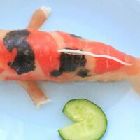 「生ハム錦鯉★ニシキゴイ★サラダ&おにぎり」の作り方。生ハム金魚の第2弾!今度は生ハム錦鯉(ニシキゴイ)を考えてみました。ポテサラバージョンとおにぎりバージョンの両方紹介! 材料: ポテサラ、ニンジン、生ハム