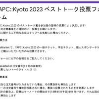 YAPC::Kyoto 2023 のベストトーク賞を参加者の皆様の投票により決定します! 以下の注意事項をご確認の上、投票をお願いします。 投票に関するご不明な点はスタッフへお気軽にお尋ねください。 * 投票方法 PassMarket で、YAPC::Kyoto 2023 の一般チケット、学生チケット、個人スポンサーチケットをご購入いただいた方の…