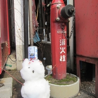 鳥取県三朝町 単頭口固定式 2012年2月 雪の三朝温泉にて。 当時3歳のお姉ちゃんが雪だるまを作って記念写真。 消火栓自体は漢字と英語表記を共につけてます。 吐出口がフランジになってボルト止めされているタイプ。 メンテナンスのために分解できるようになっているのかもしれません。