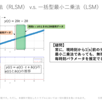 実現したいこと Matlab/Simulink ダウンロードURL 併せて確認推奨の過去記事 実現したいこと 一括型最小二乗法(LSM)でも逐次的に計算できるのでは? 逐次最小二乗法(RLSM)との比較 計算コストの観点から比較 Matlabを用いて検証 上記のppt素材は下記を参照: ppt素材:基礎的な数学(無料公開) - 理系大学教員の本気…