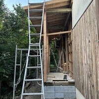 [増改築工事] 「海内」特派員報告(笑)あそこの現場のレポートが写メ(写真メール)で「速報」が届いておりみなさまへも・・・・ 台風の時期屋根までは、特に早くしないと・・・・ 増築部分 主に浴室(システムバス)とトイレが「張り出して(増築して)」広くなるので、シンブルに屋根(たぶん板金)の下地、木部が出来…