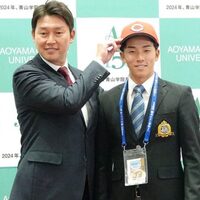広島の新井貴浩監督が26日、楽天から6位で指名された青学大・中島大輔外野手に「楽天入団おめでとう」と“異例のエール”を送った。この日、広島が1位で指名した常廣羽也斗投手の指名あいさつに来ていたタイミングで、中島が指名。その際に、他球団の指名選手を祝う“神対応”を見せた。
