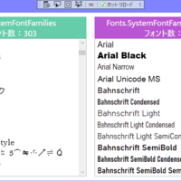 結果 コード 本当のフォント名はWin32FamilyNamesで フォント一覧表示のアプリ アプリのコード 参照したところ 感想、WinFormsと比較してみる 関連記事 結果 今回の結果 左がFonts.SystemFontFamiliesからそのまま取得できたフォントリストで303種、右はそれプラスひと手間かけて取得したフォントリストで376種 Arialって…