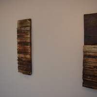 (承前) 大石俊久さんは札幌の陶芸家。 一般的な器も作りますが、個展やグループ展で発表するのは、ダイナミックなインスタレーションなどが中心です。 今回は平面の壁掛け作品が多いです。 土の存在感を生かした「基層」「表層」といった作品。 備前でよく見られる火だすきの技法が用いられています。 もっともご本人は「…