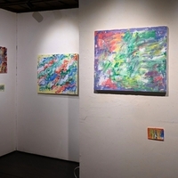 2024年6月にゴルディロックスで2人展を開いて以降、矢継ぎ早に展示をしているHIRATA さん。ペインティングナイフを駆使した油彩の抽象絵画を、高さをそろえずに展示しています。 30号以内の板やカンバスに描いた18点と、ポストカード大の紙片に描いた9点。いずれも題はついていません。「紙に描くのはダメらしいんですが、…