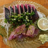 中村から約一時間半やって来ました 久礼大正市場 「しんこ」を ぶっしゅ柑でいただくために!! 下が「しんこ」の刺身 上は「かつおのたたき」 小さい節を切って下さいました 実は 電話した先を勘違いしておりまして 予約をしたのは 「田中鮮魚店」さんでした この左上の「カツオ」を タタキにして 「しんこ」と一緒にお皿…