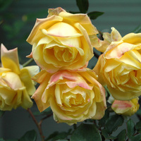 柔らかな黄色の中〜大輪房咲き品種です。整った高芯剣弁で、気候によりローズピンクのぼかしが入ります。ほのかに芳香もあり、枝数多く花付きも良好。照葉が美しく、直立気味のまとまりのよい樹に育ちます。