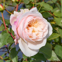 豪華な芍薬咲きの花型と、クリーム色にわずかにピンクがかかる、デリケートな色調がとても美しいばらです。花色は気温に左右される度合が大きく、秋の花はとりわけ素晴らしい。