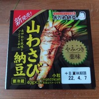 つい昨日のスーパーで見付けた 新発売「山わさび納豆」。 茨城のタカノフーズさんの商品です。 原材料は外国産の丸大豆。 山わさびは西洋わさびで作られています。 蓋を開けると、薬味の山わさびと 昆布だしの納豆のたれ。 納豆のたれは、手が汚れないように開けることができるものになっています。 これはとてもありがた…