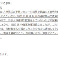(訂正)「公認会計士の辞任及び一時会計監査人の選任に関するお知らせ」 の一部訂正に関するお知らせ(PDFファイル) ピクセルカンパニーズ(東証スタンダード)の監査人の異動関連のプレスリリース(2025年11月27日)。 11月20日に、監査法人アリアの期中辞任を開示し、26日に、監査法人 Ks Lab.が一時会計監査人就任に…