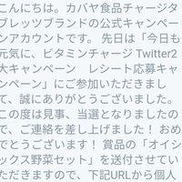今日も何も届かなかった けど ツイッターにDMが届いてました♪ 1月6個目 カバヤ ビタミンチャージ オイシックス 1月8日締め切りで 締切前日ぐらいにキャンペーンに 気付き応募しました オイシックス初めて当たった~ 楽しみ(o^―^o)ニコ やっとすこし気分が晴れたよ これで残りの応募がんばれる Oisix(おいしっく…