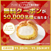 50,000名にたっぷりクリームのダブルシュー無料クーポンが当たる懸賞情報です