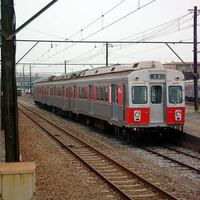 (愛知県豊橋市高師町 2005年7月5日) 豊橋鉄道高師の留置線に停車する旧東急クハ7505のク2806・デハ7401のモ1856・デハ7205のモ1806。ダイヤモンドカットは、前面の「くの字」の角度を表す俗称。