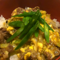 008 とろとろ卵で、大盛牛とじ丼!Rice bowl with beef and half raw scrambled eggs