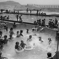 1956年の台風で壊された南端の堤防が完成した際に25メートル淡水プールが作られた。左のビニールプールとともに泳ぎ場のない島の子に贈られた=1958年8月