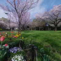 The scene is a realistic depiction of a vibrant park in full spring bloom, exuding a cheerful and refreshing atmosphere under a bright blue sky. A winding paved path snakes through expansive green lawns, bordered by meticulously maintained flowerbeds bursting with colorful tulips, pansies, and otheā¦