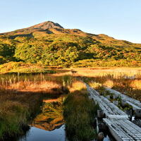 (本頁は「黒い鳥海山(2025年10月4日)」の続きである。)この日は朝7時頃、祓川の竜ヶ原湿原に到着した。日は既に高くなっているのに、この時の鳥海山や湿原は何故か黄金色に輝いて見えた。 縦構図で逆さ鳥海を。 これら写真は祓川ヒュッテの玄関前の石の上から撮ったものだ。 湿原の中に踏み出すと、右手奥に稲倉岳が見…