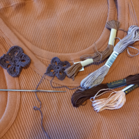 インナーにタンクトップをよく着るのだけれど、どうも胸元の開きが気になる。もうちょっと胸元がつまったのがないのかなぁと探すのだけれど、いいのが見つからず、そうだ、レース編みで胸元だけ編めばいいじゃない?と思いつきました。 思いつくと、すぐ作りたい・・・のだけれど、それっぽい編み図が見つからない。つけ襟…