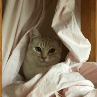 今日は祝日。朝から息子と娘の寝具類の洗濯をした。 午後からお天気が崩れる予報だから、早めに干して3時頃、雨が降り出す前に取り入れた。もう少し干しておきたいから、ベッドマットレスのカバーをダイニングの椅子に、掛けて置いた。 そしたら・・・ しおんが椅子から引っ張って、中にこもってた(笑)。可愛いから許して…