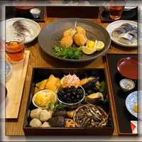 今年は元日に息子一家。 息子一家だけで、おせちは関心薄いので、ほぼ普通の献立。 揚げ物を仕上げながらでしたから、料理写真はほとんど取れず、食べている途中写真だけですが・・・。(^^;) 備忘録として: お重には「黒豆・田作り・ギンダラの西京漬け・なます・数の子・栗きんとん・煮物」 今年は色味の淋しい地味なお…