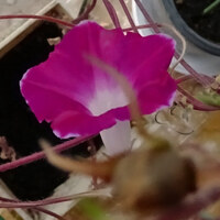 既に当地では先日初霜がおりたとのことで、着実に冬へと向かっている。とはいえ、日中は意外と気温が高めの感じの日もまだまだある模様。 そんな時期なので、もはや葉っぱも全て枯れて落ち、あとは種を回収するのみの時期に入ったアサガオに、思いがけず一輪、これが本当に今年最後と思われる開花が確認された。前日に、長…