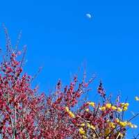 今週は、ずっと雨か曇天のようで、気持ちも沈んでしまいそうですが、気温は急に春になりましたねぇ。 お陰で、うちの寒い地域でも、梅の花も一気に花開きました。 この土日、雲一つない青空に、紅梅と蝋梅が映えてまして。おまけに、昼間のお月様が。上の写真の、上の方の白いものです(笑)わかりますかね? 香りも、より…