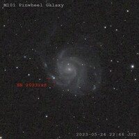 5月24日の夜は公園にでかけておおぐま座の銀河 M101 (Pinwheel Galaxy / 回転花火銀河)を撮りました。もちろん話題沸騰中の超新星 SN 2023ixf が目当てです。平日だし天気は微妙だったし体調も良くはなかったのですが、天気予報的にも月齢的にもこれを逃すと当分撮れなさそうだし、すると次の機会には減光してもう横浜から…