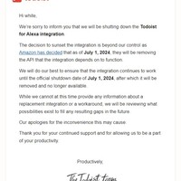 The decision to sunset the integration is beyond our control as Amazon has decided that as of July 1, 2024, they will be removing the API that the integration depends on to function. Todoistからお知らせメール来た。 訳)AmazonがAlexaのリスト(ToDo・買い物リストなど)のAPI連携止めるって決定したから20…