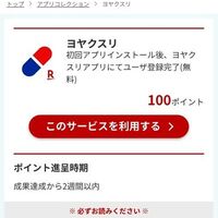 楽天ポイントモールを経由して、初めてヨヤクスリのアプリをダウンロード&ログイン、ユーザー登録を完了すると、楽天ポイント100ポイントが貰える! さらに薬局をお気に入り登録するだけで、100ポイント貰えるキャンペーンも開催中です。