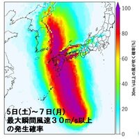 台風10号は、6日(日)から7日(月)にかけて、九州に接近または上陸する恐れがあります。台風が日本に影響している間に最大瞬間風速が30m/s以上となる確率をエリア別に示しました。