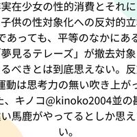 非実在少女の性的消費とそれによる子供の性対象化への反対的立場であっても、平等のなかにある「夢見るテレーズ」が撤去対象になるべきとは到底思えない。反対運動は思考力の無い吹き上がった、キノコ@kinoko2004並の勘違い馬鹿がやってるとしか思えない。